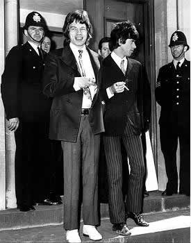 Rolling Stones Mick Jagger and Keith Richard coming out from Chichester Magistrates Court (1967)